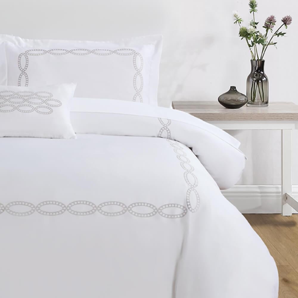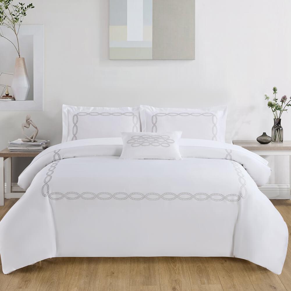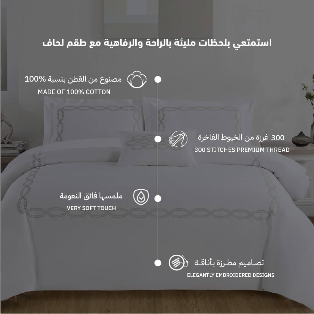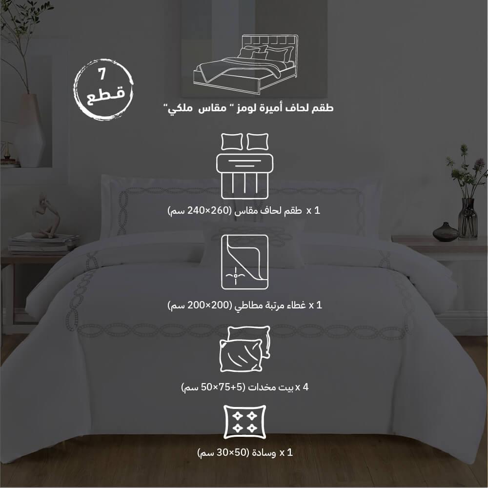 استمتعي بلحظات مليئة بالراحة والرفاهية مع طقم لحاف مطرز مقاس ملكي من أميرة لومز. هذه المجموعة مصنوعة من القطن بنسبة 100% مع عدد 300 غرزة من الخيوط الفاخرة، التي توفرلك نعومة وأناقة لا مثيل لهما لتحويل غرفة نومك إلى ملاذ هادئ